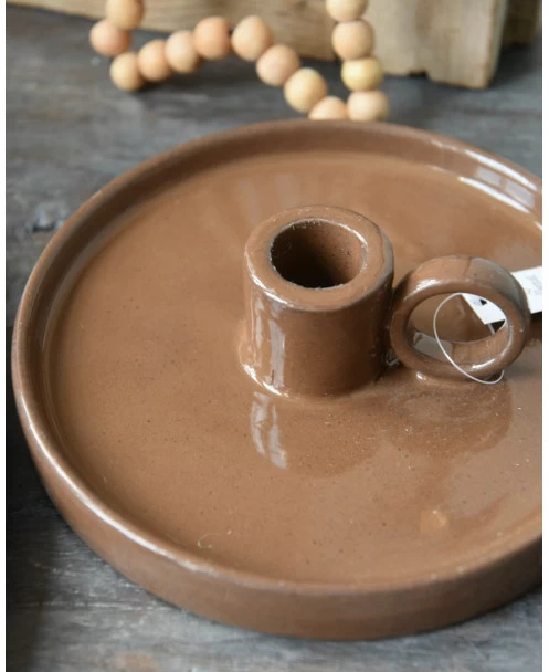 Aardewerk kandelaar met oor bruin, IB Laursen. Deze kandelaar heeft een echte vintage look. Het mooie materiaal en het model is heel herkenbaar en toch ook echt van nu. De kandelaar is van aardewerk met een licht glanzende afwerking in het bruin, de ‘druip’ schotel is plat met een opstaand randje en een kaarsen inzet met oor. In de kandelaar past een normale tafelkaars (2,2 cm diameter). Zowel de korte als de lange tafelkaarsen staan erg mooi in dit model.