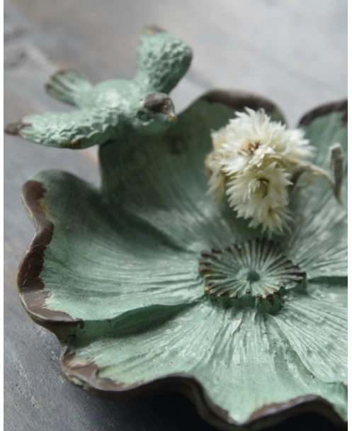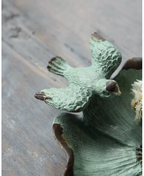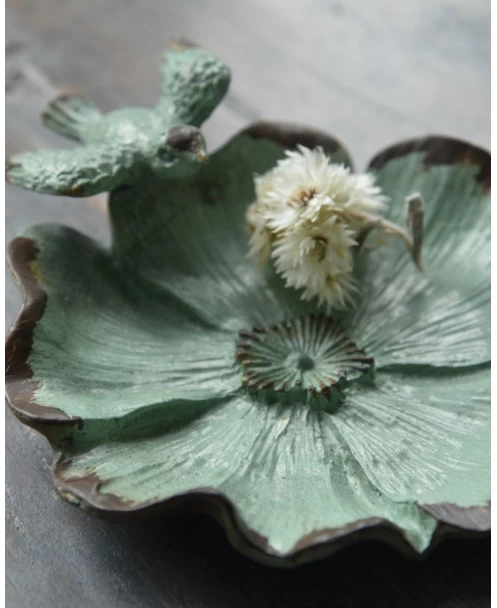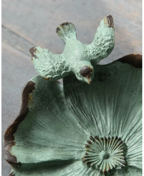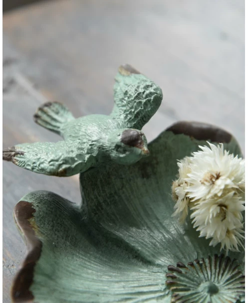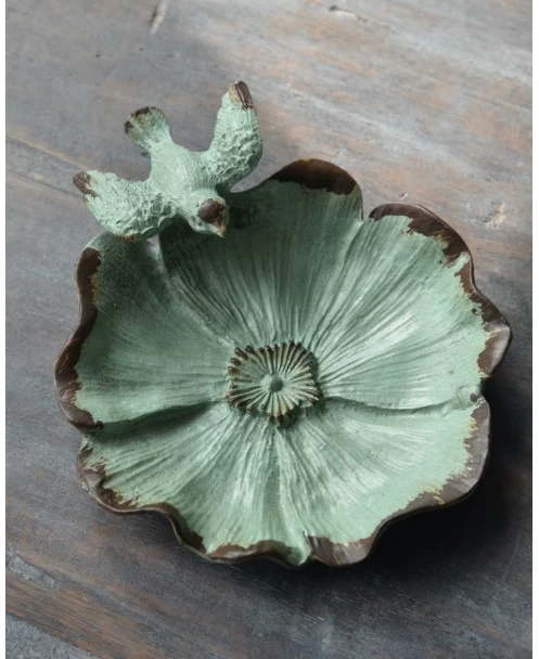 Bloemvorm antiek turkoois schaaltje met vogeltje per stuk. Dit mooi gevormde schaaltje van metaal met een antieke turkoois afwerking is een bloem met een vogeltje op de rand. Het schaaltje is al sierlijk genoeg om zo neergezet te worden. U kunt het bijvoorbeeld gebruiken als sieraden schaaltje op de kaptafel of voor de sleutels……