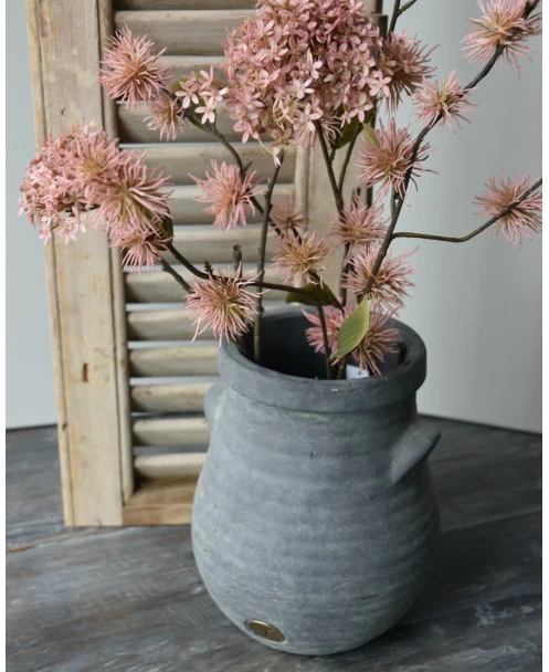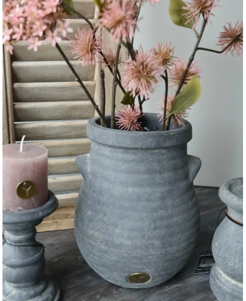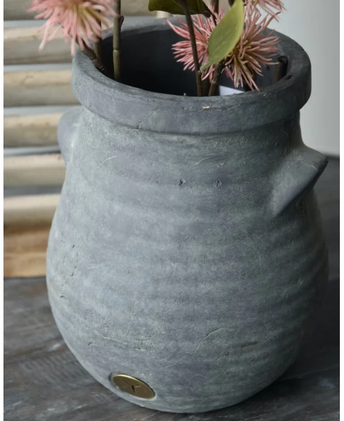 Bolle vaas met ribbel reliëf en dichte oortjes Majestic, Brynxz. Deze mooie vaas/pot heeft een elegant model met een grof ribbel reliëf, een dikke kraag en twee dicht oortjes. De pot is van aardewerk en heeft een Majestic vintage afwerking, aan de voorzijde zit het Brynxz logo in de pot verwerkt. U kunt de pot als vaas met zijde bloemen of als pot met bv een mooie hangplant decoreren. De vaas/pot is niet 100% waterdicht, we adviseren om altijd een binnen vaas/pot of plastic te gebruiken.