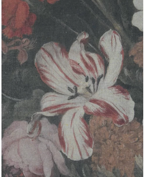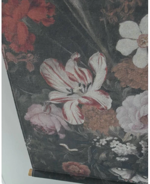 Brocante wanddoek met bloemen. Dit prachtige doek van bloemen is een nadruk van een van de bekende schilders. Het doek is in een iets matte uitvoering wat de afbeelding een zachte uitdrukking geeft. Het doek heeft aan de onderzijde en bovenzijde een houten stok waarmee het mooi recht blijft hangen. Aan de bovenkant zit een touw om het mee op te hangen. Â
