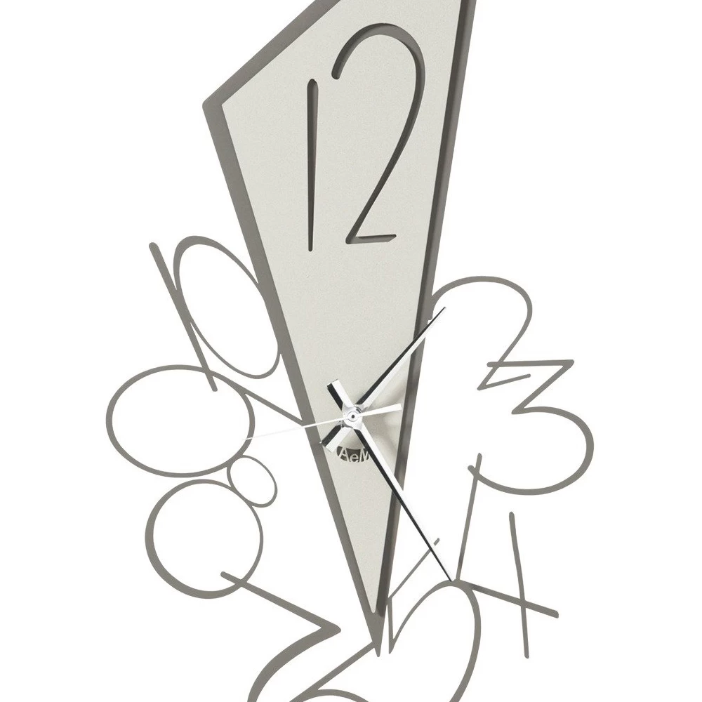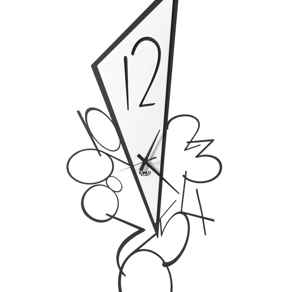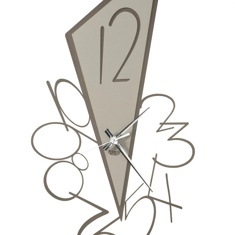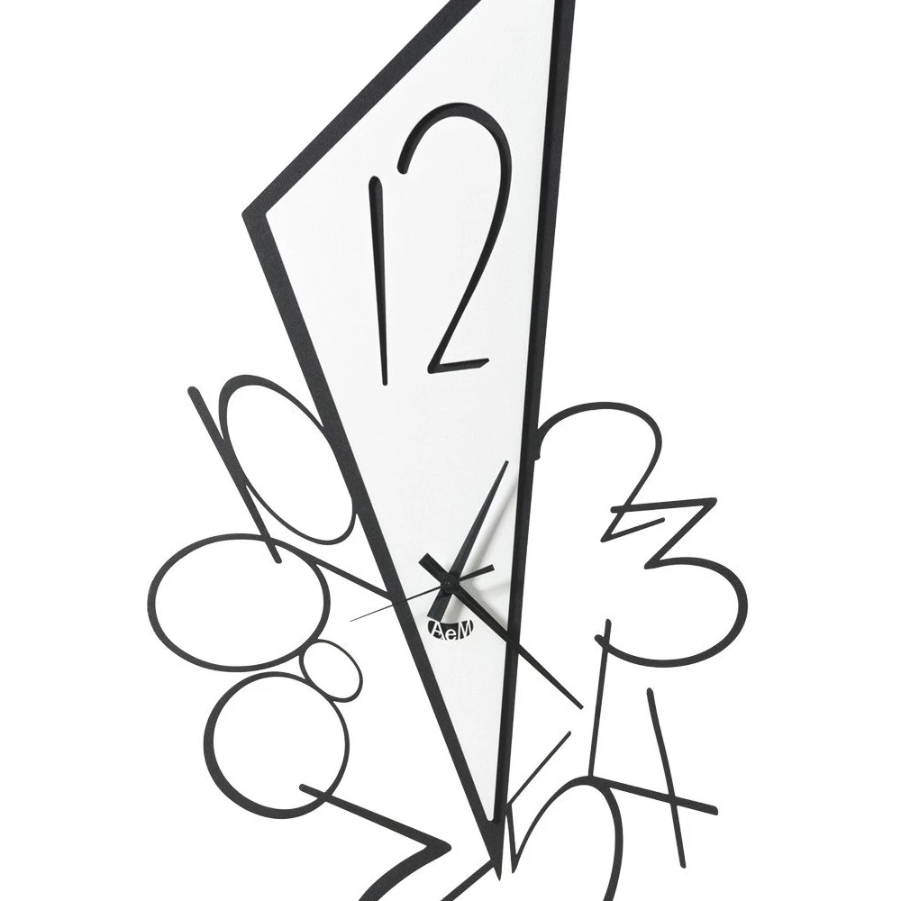 Deze wandklok heeft een extreem onregelmatig origineel ontwerp. Zijn eigenaardigheid wordt gegeven door de driehoekige vorm en door een deel van gestileerde Arabische cijfers die rond de wijzerplaat zijn gerangschikt, alsof ze een frame vormen.