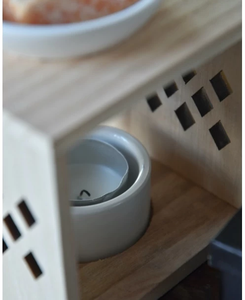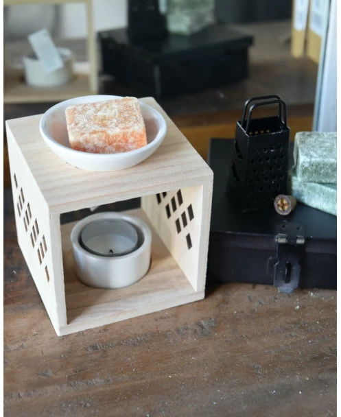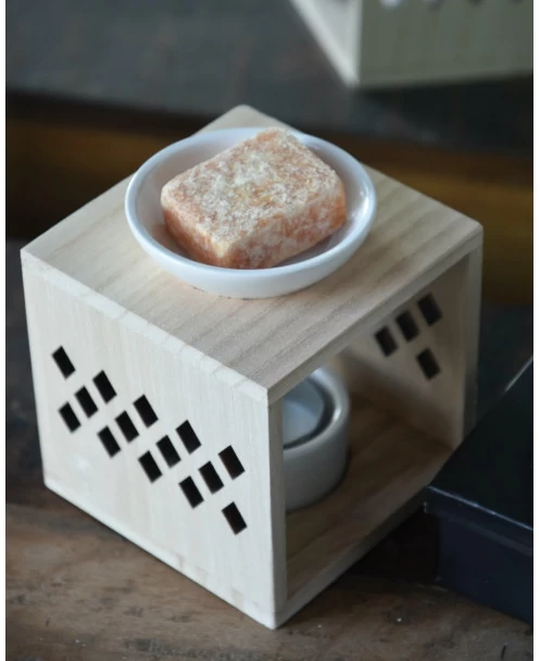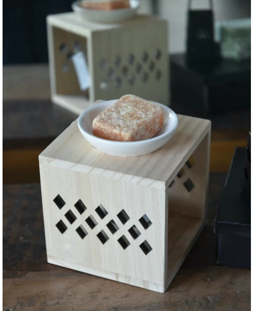 Geur brander hout met keramiek schaaltjes. Deze leuke geurbrander is in een kubus model en van naturel hout gemaakt met twee keramiek schaaltjes voor het waxinelichtje en voor een amber blokje. Aan de zijkanten van de brander zit een ruitvormige gaten patroon voor een sfeervol licht, wanneer er een amber blokje (of een stukje ervan) in het bovenste schaaltje wordt gelegd en gesmolten ontstaat er een heerlijke geur die nog intenser is. De brander is exclusief Amber blokje en waxinelichtje.