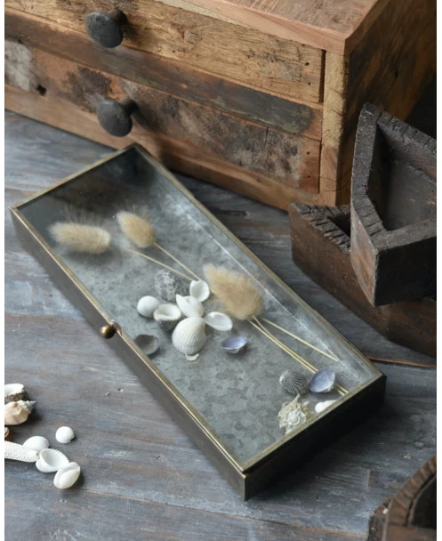 Glazen kistje in antiek-look met zinken bodem, IB Laursen. Dit leuke kistje is van metaal met een antiek-look handgemaakt met een glazen deksel. De bodem aan de binnenkant is in zink en de buitenkant zowel de zijkanten, bodem en deksel frame met knopje heeft de antiek-look. Het kistje is langwerpig en kan worden gebruikt om mooie vondsten in uit te lichten, of een mooi sieraad, schelp of kaartje…., ook wordt het kistje vaak op de kaptafel gebruikt met bv wat armbandjes e.d. Het kistje is met de hand afgewerkt waardoor ieder kistje een uniek uiterlijk heeft en daardoor ook zijn eigen oneffenheden. Dit hoort bij de charme van het product.