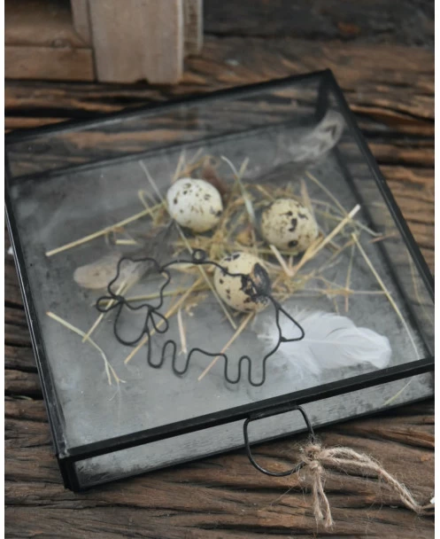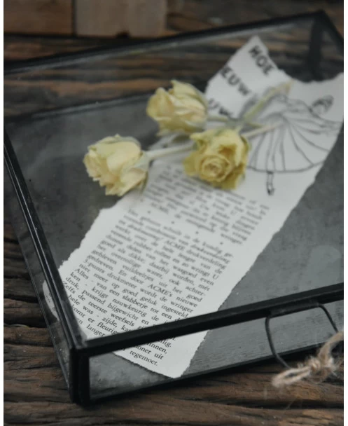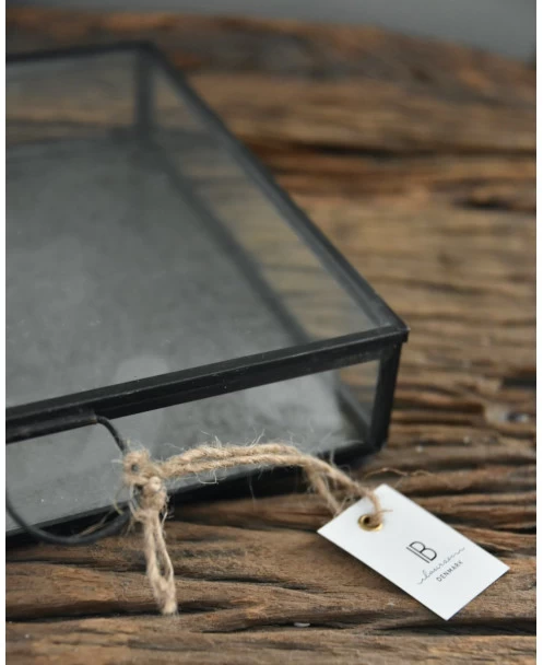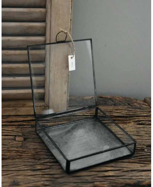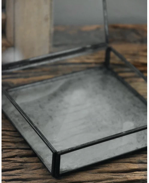 Glazen kistje met zinken bodem, IB Laursen. Dit kistje heeft een laag vierkant model. Het kistje heeft een zinken bodem en de zijkanten en het deksel zijn van glas. Het deksel heeft een metalen ‘sluiting’. Het kistje kan mooi worden gedecoreerd met bv gevriesdroogde bloemen, of in thema voor het voorjaar of met uw eigen bijzondere gedenkwaardige items. Doordat er met de hand het glas is ingelegd kunnen er kleine oneffenheden in het kistje zijn, dit hoort bij de charme van het product.