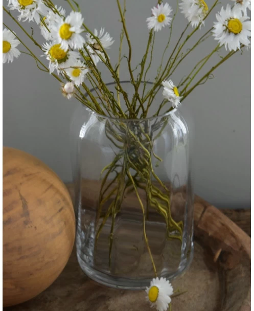 Glazen vaas/windlicht met reliëf. Deze vaas is transparant met een facet stroken die iets scheef lopen. De bovenzijde van de glazen vaas loopt iets naar binnen toe en de rand is geslepen. U kunt het glas zowel met wat takken of droogbloemen opmaken, als hem als windlicht gebruiken.Â