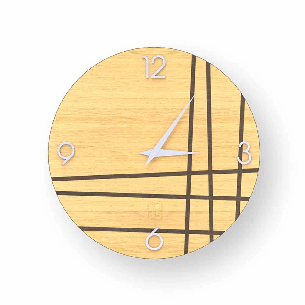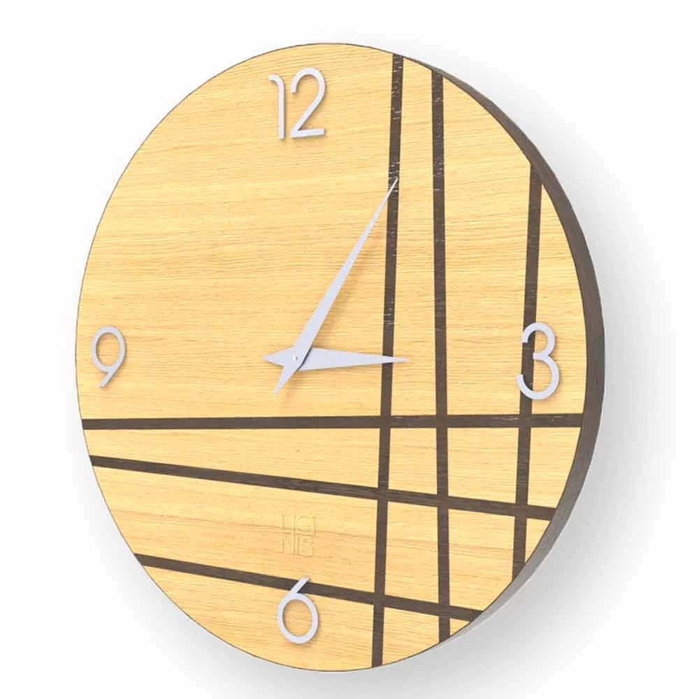 – Warm: eiken en wengékleurige zijkanten. De rand is in wengégekleurde zijden en de wijzers en cijfers zijn van natuurlijk aluminium;
