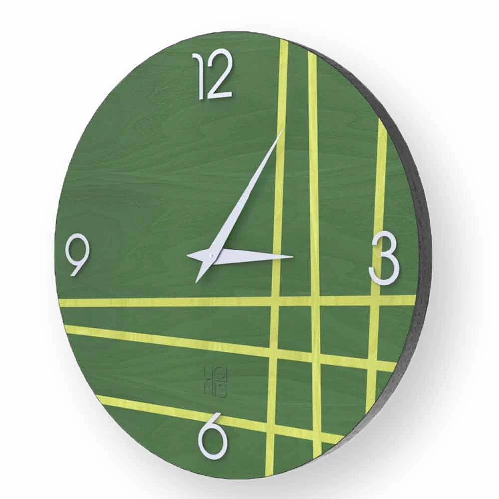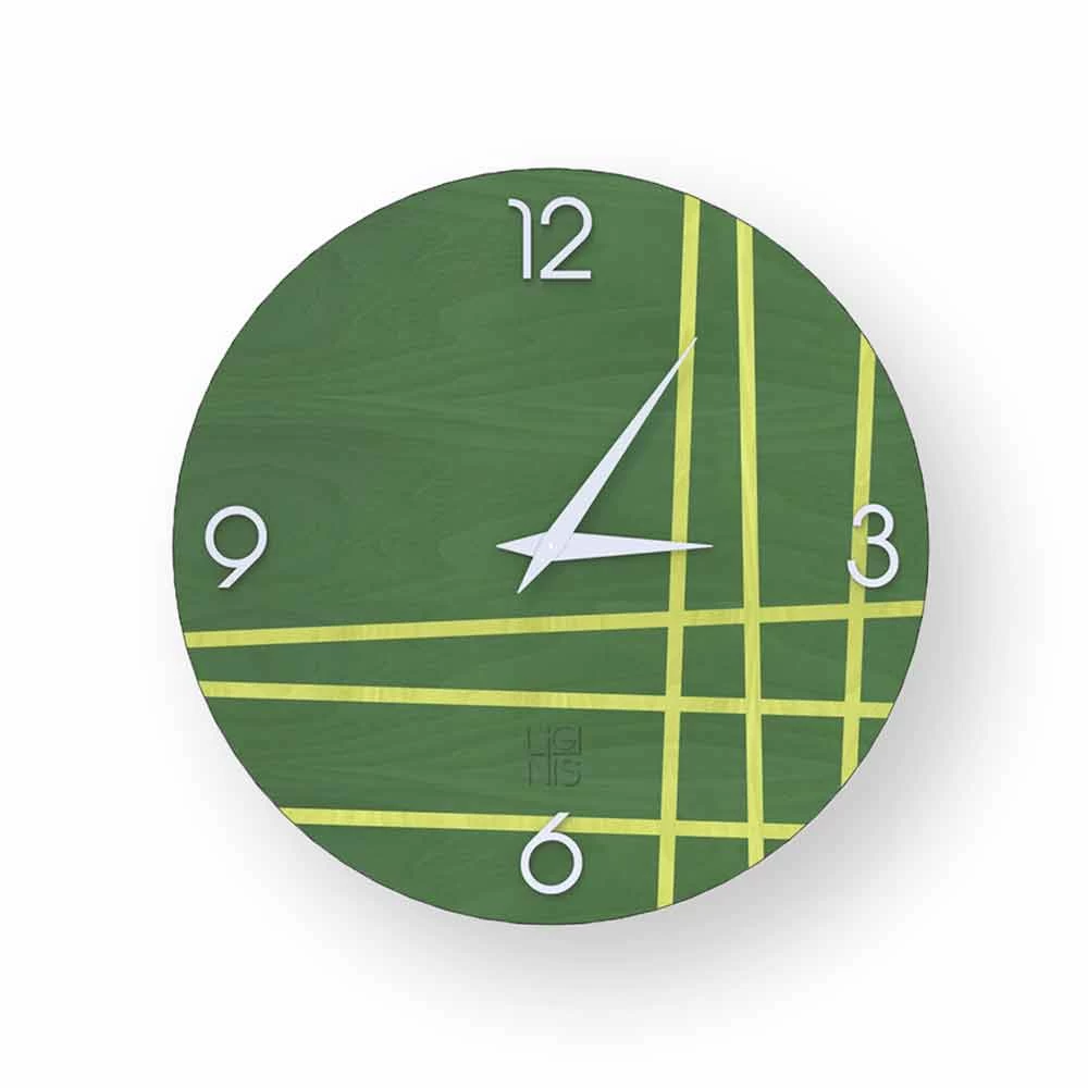 – Kleuren: hout essence groene bolivar en groene pistache bolivar. De rand is in zwarte as en de wijzers en cijfers in natuurlijk aluminium.