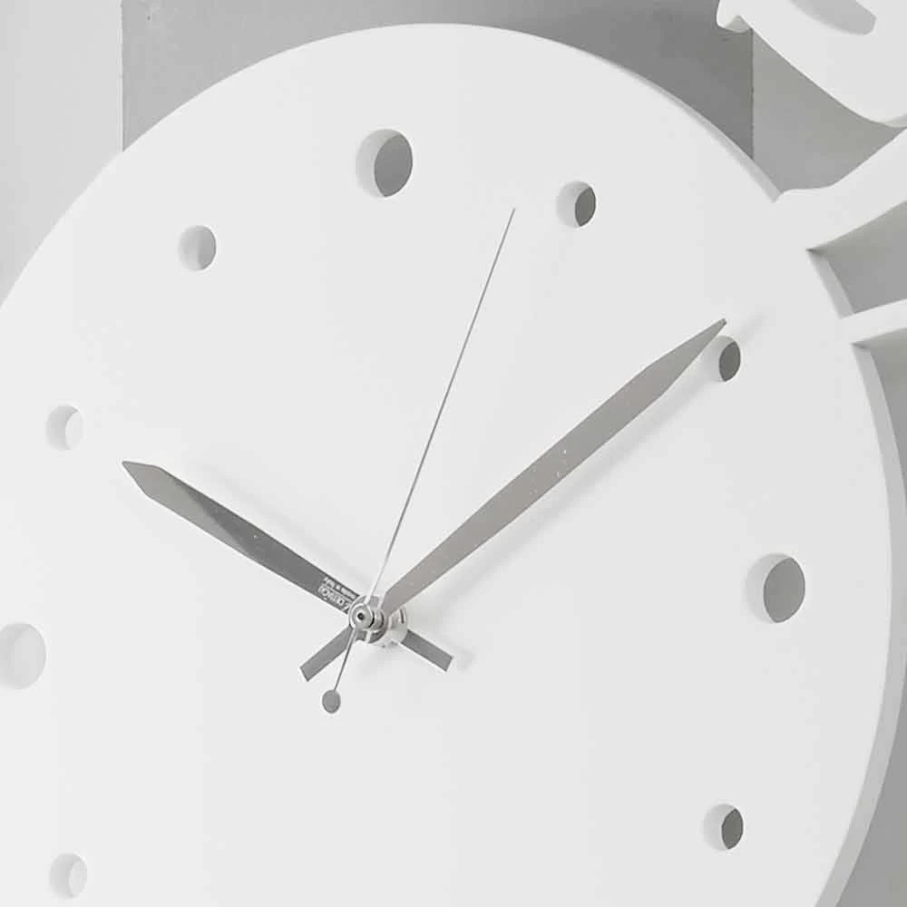Grote en originele wandklok met modern rond design, in wit, zwart of grijs hout, met kittens, made in Italy.