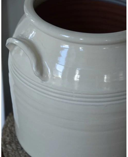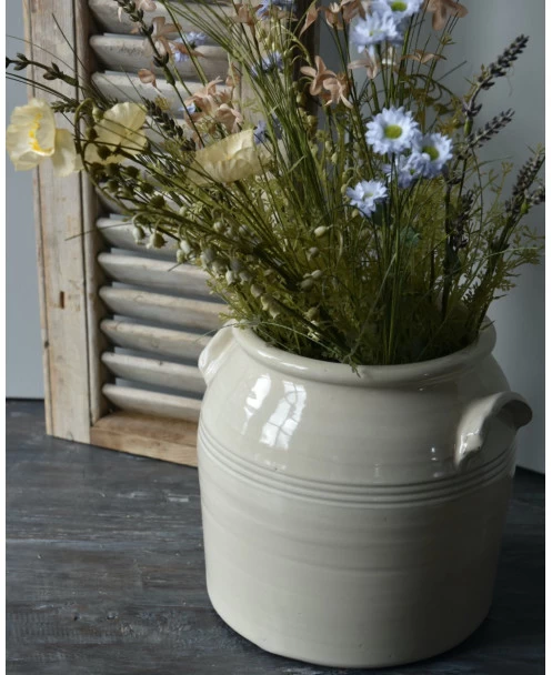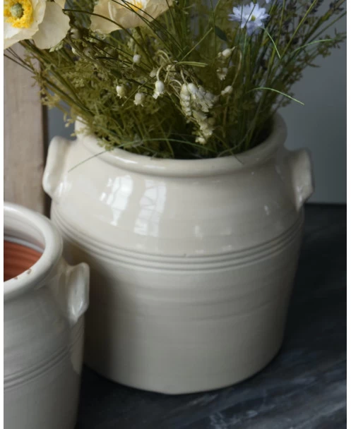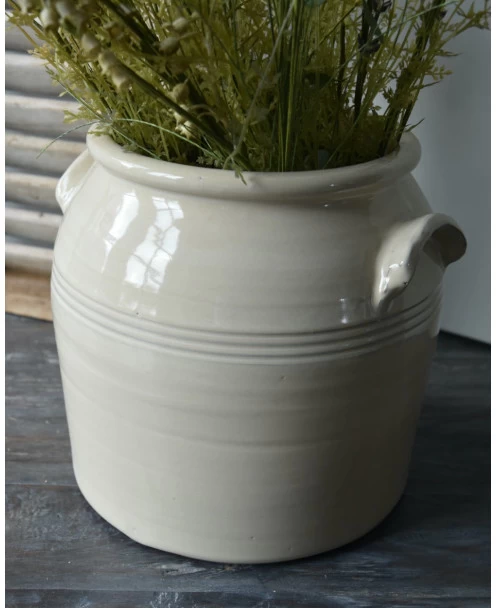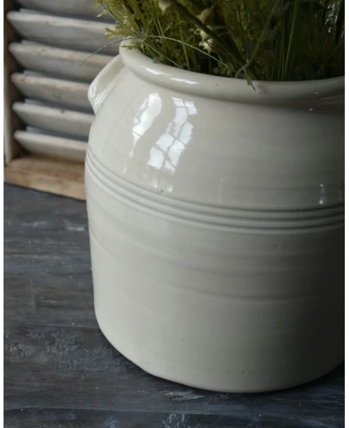 Grutters pot groot met twee dichte oren, IB Laursen. Deze prachtige pot is in model van een oude grutters pot en ook de zachte tint komt overeen. De aardewerk pot is met de hand gemaakt en heeft een zware kwaliteit. De lichte bolling, de horizontale lijnen, het model van de oortjes en de kraag geven de grutters pot eer. De nieuwe pot is van het Deense merk IB Laursen en is ook in een kleiner model verkrijgbaar. Doordat het handwerk is, heeft iedere pot zijn eigen kenmerken, oneffenheden en karaktertrekken die deze pot zo stijlvol maken. U kunt de pot met bv de zijde bloemen opmaken, een mooie plant of met wat takken decoreren. De pot is aan de buitenkant geglazuurd, hierdoor is de pot niet 100% waterdicht, wij adviseren om altijd een binnen vaas/pot of plastic te gebruiken wanneer u er levende bloemen of planten in plaatst.