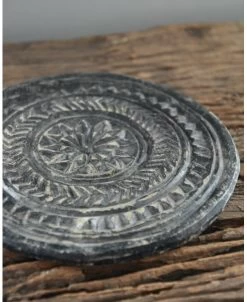 Hand gemaakt stenen sier bord. Deze prachtig bewerkt rond bord heeft een patroon van een bloem met daaromheen sierlijk uitgehouden ringen. Dit vrij zware unieke plateau is als decoratie en staat mooi met een kaars of stolp. door de grey-wash is het patroon benadrukt wat een mooi effect geeft.Â
