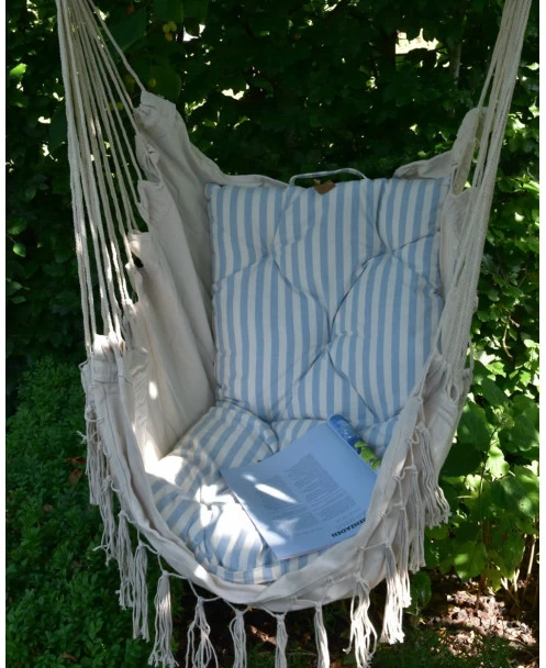 Hangstoel met kwastjes, IB Laursen. Deze leuke hangstoel van een mooie naturel stof heeft een kwastjes rand aan de onderzijde, een naturel houten stok met dik touw als hanger en een heerlijke zitting met hoge rug. De stoel kunt u een leuk plekje geven in huis, op de veranda of in de tuin bijvoorbeeld. U kunt zo in de stoel zitten of er bv een mooi matras kussen in plaatsen voor extra comfort. Een heerlijke stoel om in te wiegen, een boek te lezen en te genieten van rust….. Aan de bovenkant zit een dik touw met een lus erin zodat u hem gemakkelijk kunt ophangen.Â
