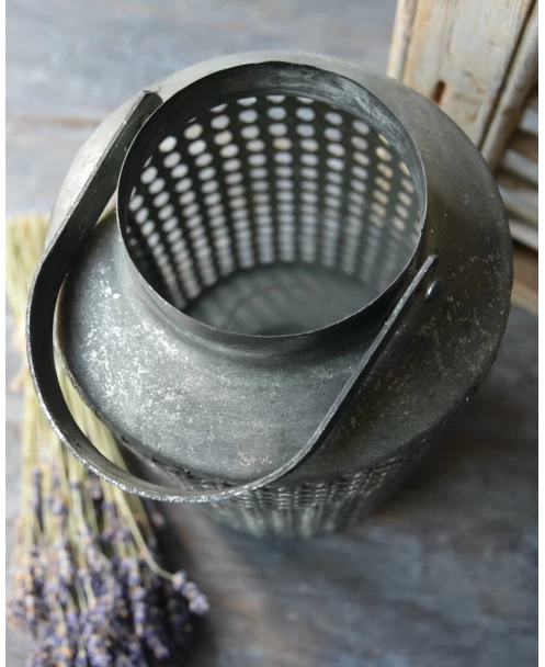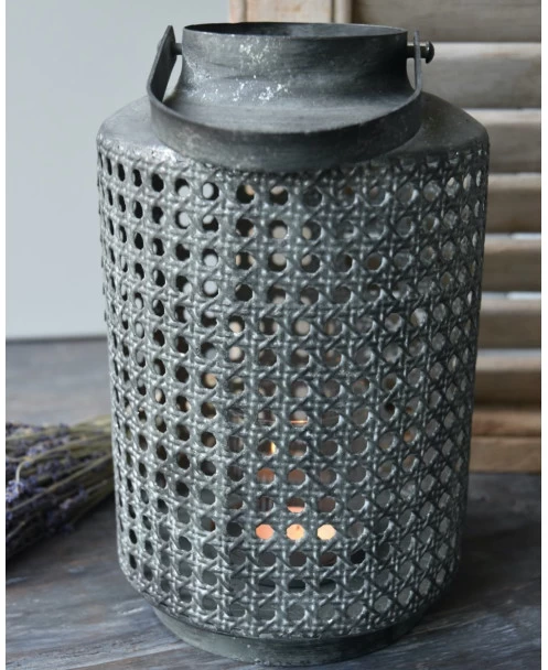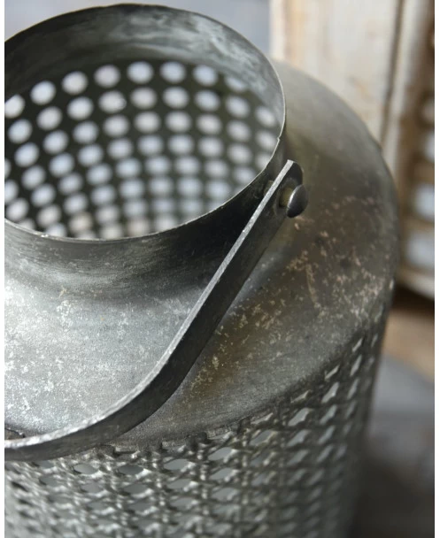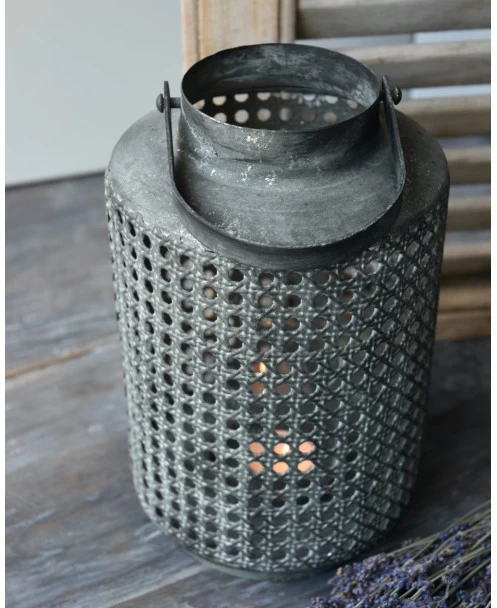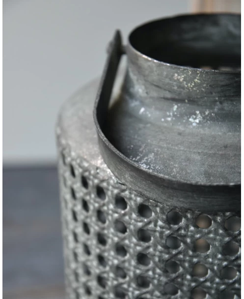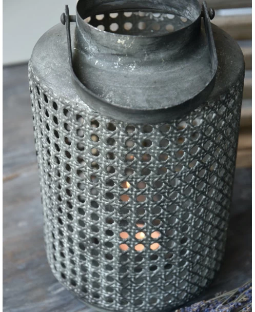 Hoge lantaarn van metaal met gaatjes patroon en hengsel per stuk. Deze prachtige lantaarn is van metaal gemaakt in een grijzige kleur en heeft een patroon van ‘gevlochten’ gaatjes die met een licht accent mooi tot zijn recht komen. In de lantaarn zit een klein cilinderglas waar u een kaars of waxinelicht in kunt branden. De lantaarn/windlicht heeft een iets smaller voet met daarop een groot gedeelte die recht omhoog gaat waar het gaatjes patroon in zit, waarna hij weer smaller wordt tot een mooie hals met een hengsel.Â