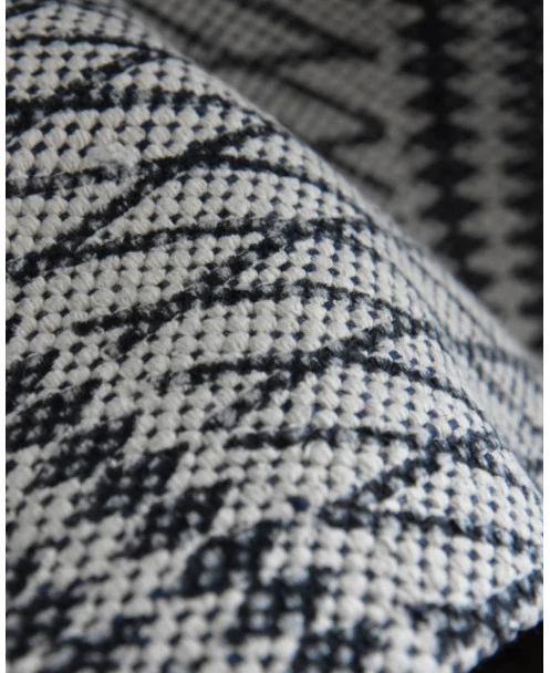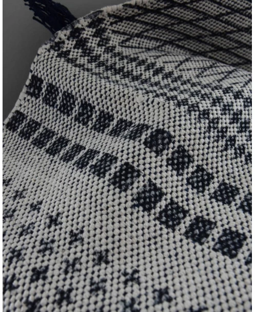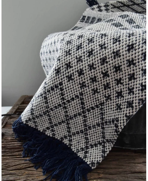 Kleed blauw gebroken wit. Een stevig geweven kleed met blauwe patronen en klosjes. U kunt het kleed mooi over de ‘leuning’ van de bank of stoel draperen, of op de vloer in de kinderkamer bijvoorbeeld.Â