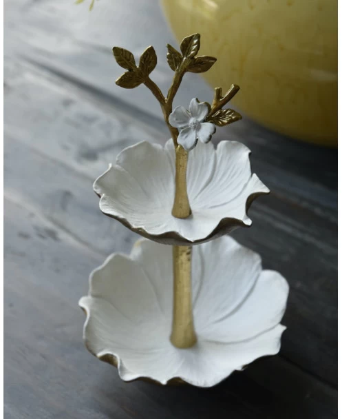 Kleine etagere bloem in antiek wit en goud, sieraden/bonbon schaaltje. Deze leuke kleine etagere heeft twee lagen in vorm van een bloem met een stengel/tak als drager die bovenop uitloopt met bladeren en een kleine bloem. De bloemen zijn in het antiek wit en de onderkant en de tak/stengel met de bladeren zijn in het antiek goud. U kunt dit leuke exemplaar bv als sieraden schaaltje gebruiken voor je dagelijkse oorbellen en ringen…, of met een verpakt bonbonnetje bv. Als decoratie in de woonkamer is hij ook erg leuk door zijn eigen elegante sierwaarde.
