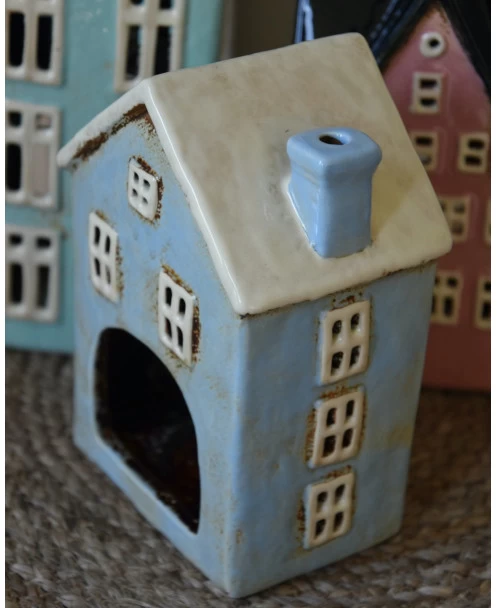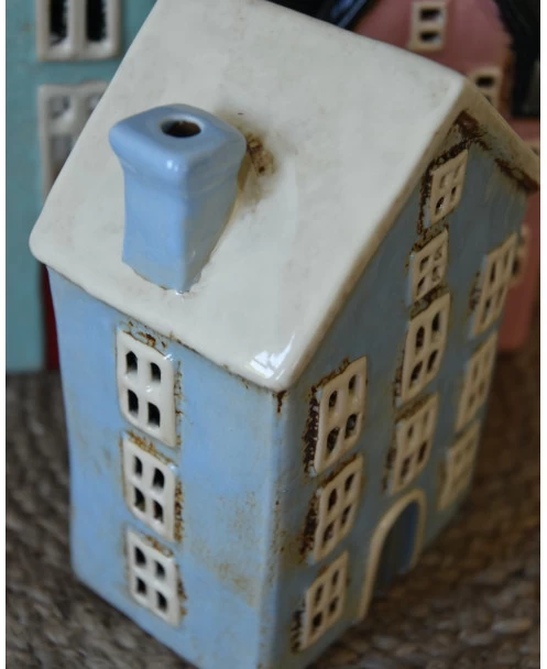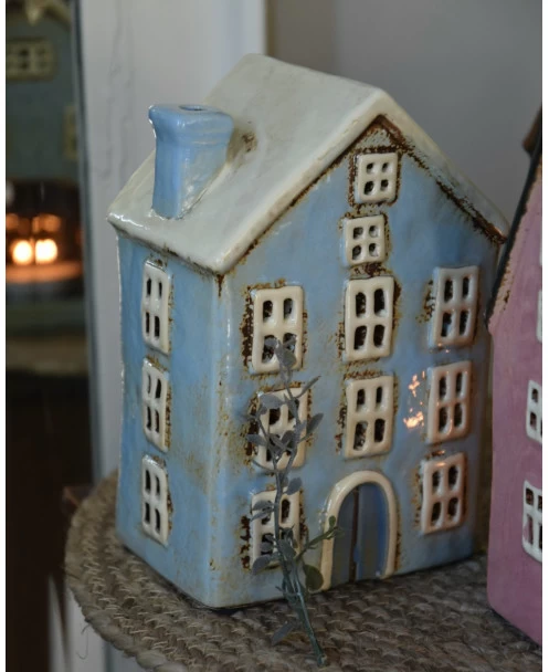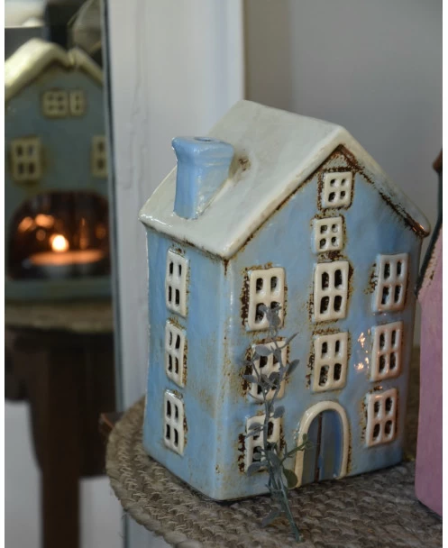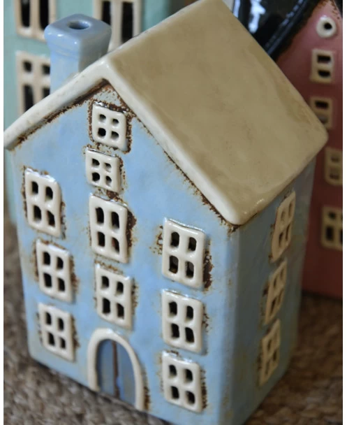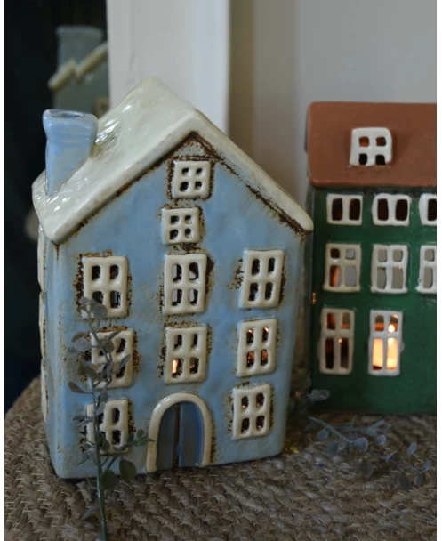 Licht blauw pakhuis Nyhavn, theelicht huisje IB Laursen. Dit leuke theelicht huisje van keramiek is in een lichtblauwe kleur met lichte ramen en dak. Alle ramen zijn open zodat het schijnsel van een waxinelichtje het hele huis gezellig verlicht. Het (pak)huis heeft een gebogen deur en schoorsteen en is geïnspireerd vanuit de Deense havenplek Nyhavn welke bekent staat om al zijn kleurrijke pakhuizen. U kunt de huisjes leuk combineren om zo uw eigen haven straatje te creëren…..Â
