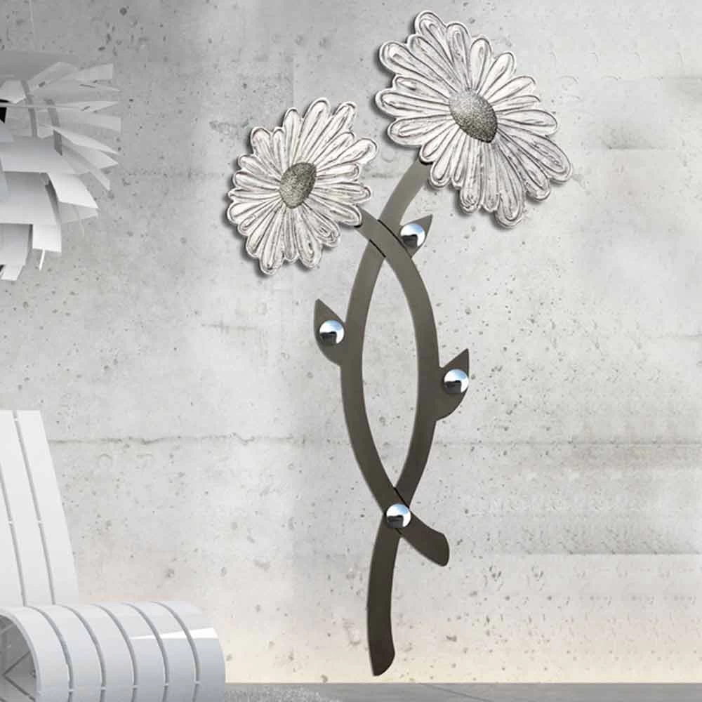 Deze fantastische hanger wordt gekenmerkt door een gevormde structuur die wordt gekenmerkt door twee bloemenelementen, die doen denken aan twee gigantische madeliefjes, gevormd in MDF en antraciet gelakt, verrijkt met twee zilveren bladelementen die met de hand zijn gedecoreerd op gestructureerd materiaal.