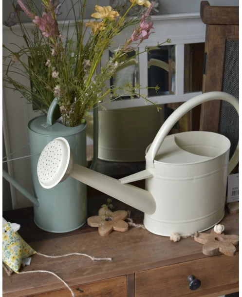 Metalen gieter in cream met sproeikop 5 ltr, IB Laursen. Deze leuke gieter is van metaal met een zachte cream/room kleurige afwerking. De gieter heeft een lange hals en er kan een sproeikop opgedraaid worden, deze is heel stevig en er zit een afdicht ring op. Aan de gieter zit een groot handvat wat sierlijk rond over de gieter loopt en er kan +/- 5 liter water in. De gieter is van metaal en verder afgewerkt met een cream/room kleurige afwerking. U kunt de gieter uiteraard gebruiken om de planten water te geven of er bv mooie bloemen en takken in te zetten. Een mooi elegant model, niet alleen handig in gebruik ook een plaatje om te zien… Kleine oneffenheden van de maak behoren tot dit product. Â