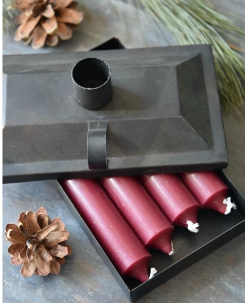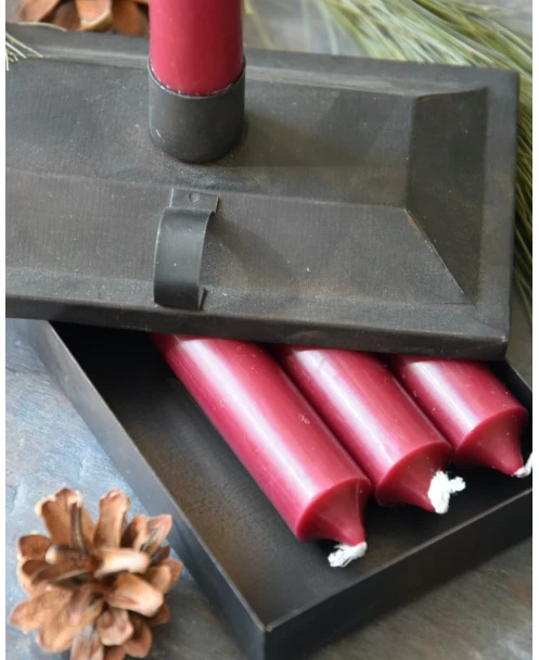 Metalen kandelaar en opbergbox rustic, IB Laursen. Deze leuke kandelaar en doos ineen is van metaal gemaakt in een rechthoekig model. Het deksel en tevens kandelaar heeft een klein oor en facet randen die het geheel zijn karakter en uitstraling geven. De kaarsen inzet is voor een normale tafelkaars geschikt en in de door passen wat kortere kaarsen. De kandelaar box is geschikt voor het gehele jaar en er kan met een kleur kaars een geheel andere sfeer ontstaan.Â