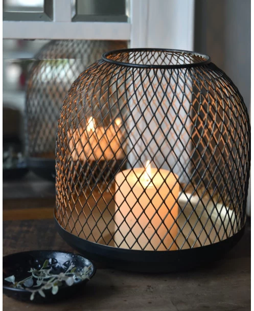 Metalen windlicht met ruit-effect zwart met goud kleurig binnenwerk. Dit mooie windlicht is van metaal gemaakt met een stevig gaas-ruit-effect in het zwart met een soort antiek-look gouden binnenkant. Door deze binnenkant ontstaat er een warme gloed wanneer er een kaars in gebrand wordt. Het windlicht past in veel verschillende woonstijlen. Er zit geen windglas in dit metalen windlicht.Â