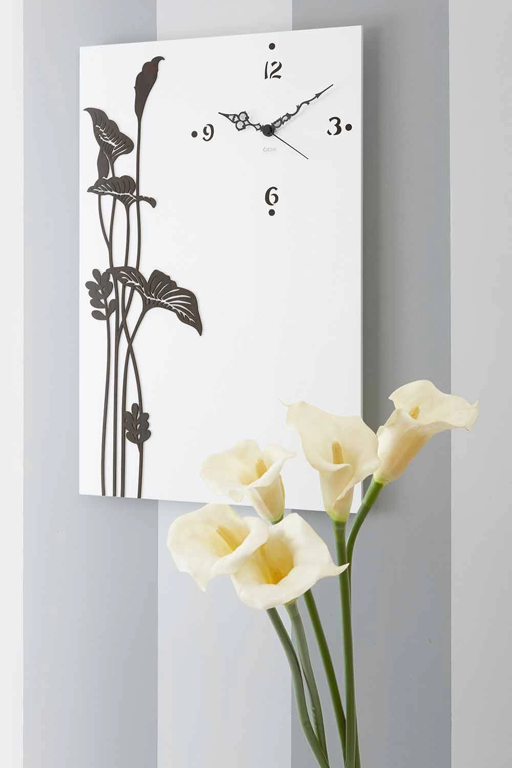 Witte wandklok met decoraties, modern houten design made in Italy.
