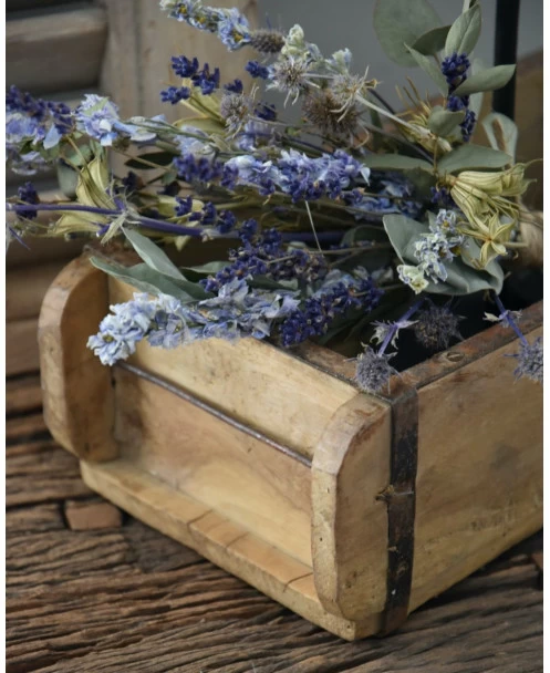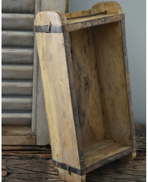 Oude houten steenmal, IB Laursen per stuk. Deze prachtige oude steenmal is in een rechthoekig model. Iedere steenmal is uniek met zijn eigen kenmerken en tinten, hierdoor zie je dat het een echt oud gebruikt product is vol karakter. Zo verschillen de bakken in tint in ‘afwerking’ en heeft de een een scheur in het hout en de ander mist een stukje metaal…..iedere steenmal is uniek. De steenmal staat mooi als bv kruiden/snijplank bak op de aanrecht. op de tafel met mos en kaarsen, met kandelaren……
