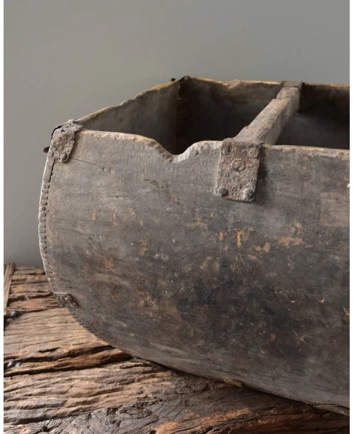 Oude rijstmaat China met prachtige details. Deze unieke oude rijstmaat heeft prachtige gebruikers sporen. Zo zijn er wat beschadigingen en de metalen binten zijn iets geroest. Hierdoor heeft de grijzige houten rijstmaat een geweldige uitstraling. In het middel is een handvat en de prachtige verbinding van het hout is goed zichtbaar. De rijstmaat is van boven vierkant en hij loopt met een ronding smaller naar beneden.Â