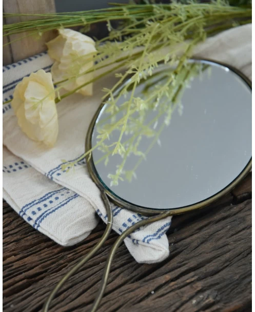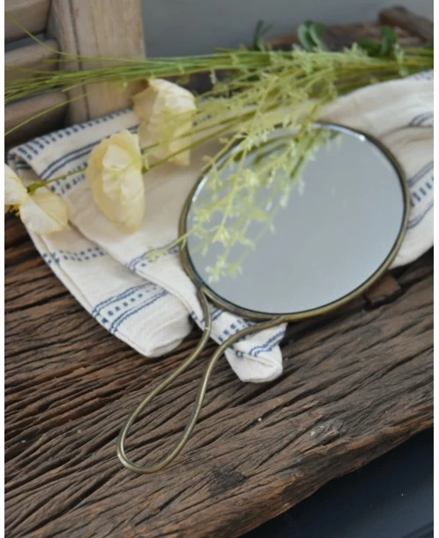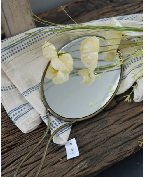 Ovalen handspiegel, IB Laursen. Deze leuke spiegel heeft een ovale vorm die wordt benadrukt Door het ronde metaal. De spiegel heeft een handvat van metaal die open is zodat u de spiegel ook makkelijk en decoratief kunt ophangen aan een rekje bijvoorbeeld.Â