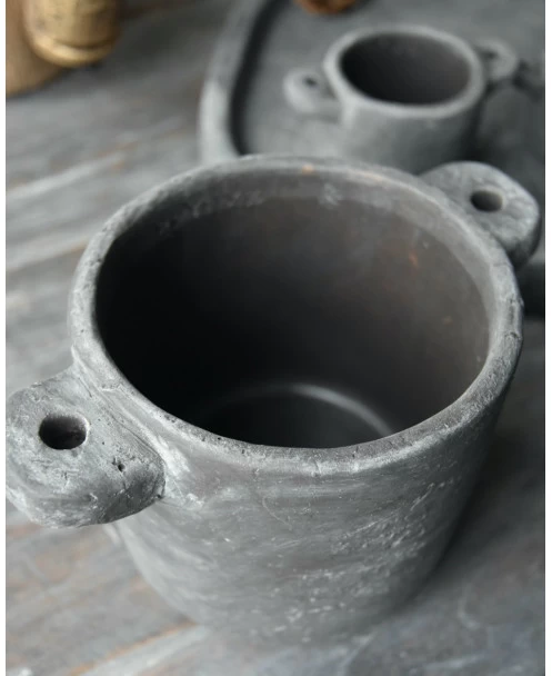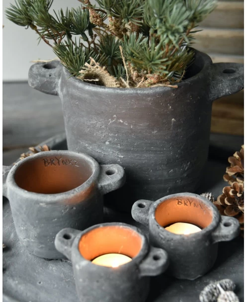 Planter pot met oren Vintage grijs groot, Brynxz. Deze leuke pot is in een recht model met twee platte oortjes van boven en in een vintage grijze kleur en afwerking. De pot kan als planter worden gebruikt en als waxine licht pot. De pot is niet 100% waterdicht en wij adviseren dan ook om er plastic in te doen als u er een echte plant in zet. In dit model zijn er ook kleinere potjes die ook erg leuk zijn om waxinelichtjes in te branden.