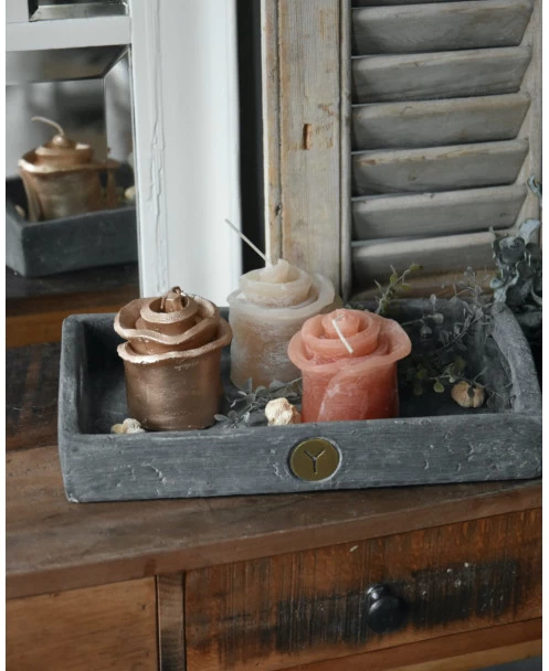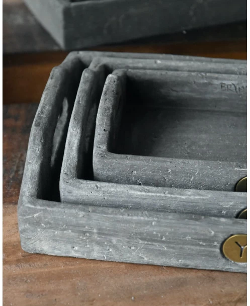 Rechthoekige tray met handvaten middel, Vintage Brynxz. Deze mooie tray in dienblad model is van zwaar aardewerk en heeft een vintage grijze afwerking. De tray heeft twee handvaten en aan de voorzijde zit het Brynxz logo in de rand verwerkt. De tray is plat met rechtopstaande randen zodat u er gemakkelijk alle kanten mee op kan en hem gezellig kunt opmaken met wat mooie potjes, kaarsen en kleine decoraties bijvoorbeeld. Het blad is (zolang de voorraad strekt) in 3 maten verkrijgbaar waarvan deze het middelste formaat is.Â