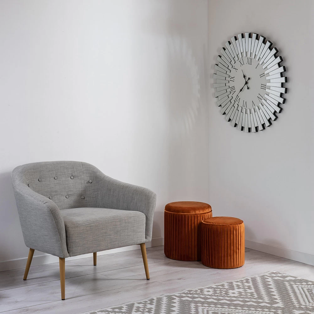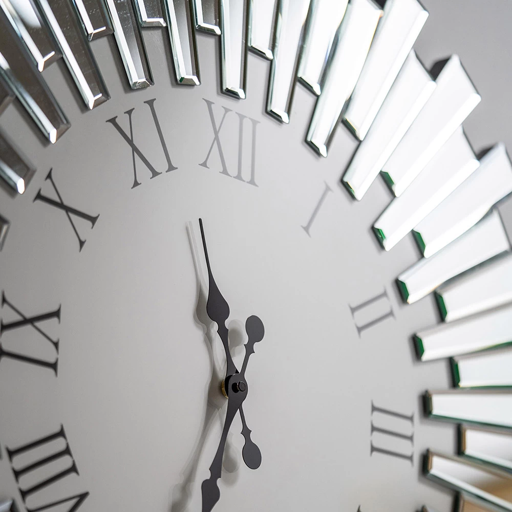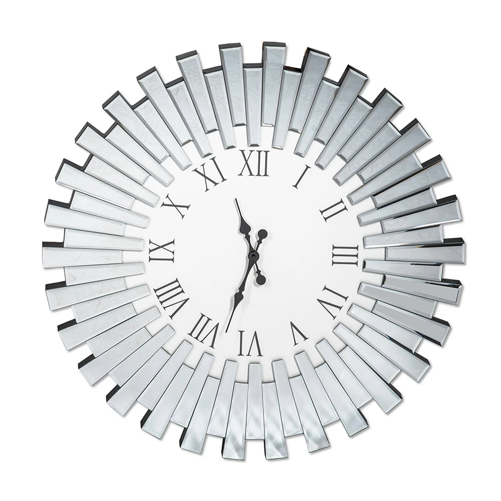 Wand- of aanrechtklok met een ronde vorm gemaakt van zilveren spiegel en MDF met frame samengesteld uit elegante geometrische elementen. Een originele en verfijnde aanvulling , ideaal voor het verfraaien van de slaapkamer, de woonkamer of de ingang van uw huis met een vleugje unieke en verfijnde stijl . Aan de achterkant van de structuur bevinden zich twee metalen haken , die nodig zijn om de klok op te hangen.