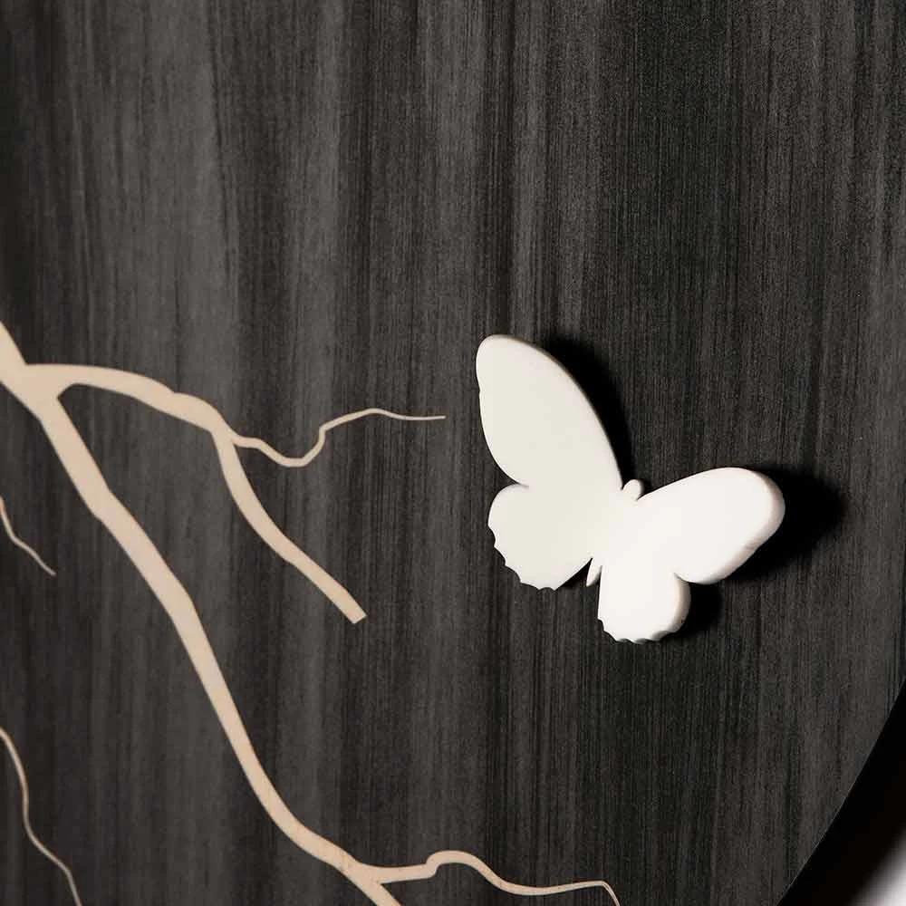 Ronde houten wandklok met lasergegraveerde versieringen en driedimensionale vlinders, gemaakt in Italiƫ.