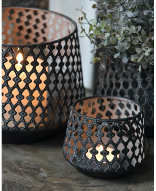 Set van 3 metalen windlichten met sierlijk gaatjes patroon. Dit set windlichten zijn elk rond, iet bol, met dicht bodem en met een sierlijk gaatjes patroon naar boven toe gewerkt. Het set bestaat uit 3 verschillende maten die mooi als set staan. U kunt de set mooi met kaarsen decoreren of ook leuk als afwisseling met een kunstplant bv. De zet is antraciet met lichtere poeder accenten die het model mooi doen uitkomen.Â