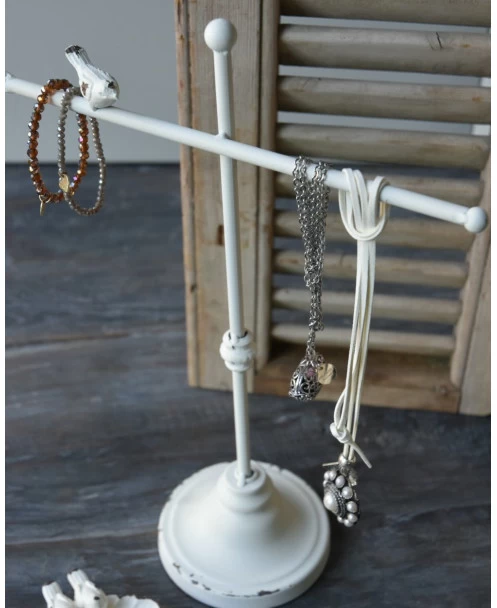 Sieraden standaard antiek wit met vogeltje. Deze mooie metalen standaard met vogeltje heeft een gebroken witte kleur die wat verouderd is. Hierdoor krijgt de standaard meer karakter en er ontstaan mooie accenten. Het vogeltje zit op de dwarsligger waar u uw kettingen en armbandjes bijvoorbeeld aan kunt hangen. De standaard combineert mooi met een ‘ringen schaaltje met vogeltjes.Â