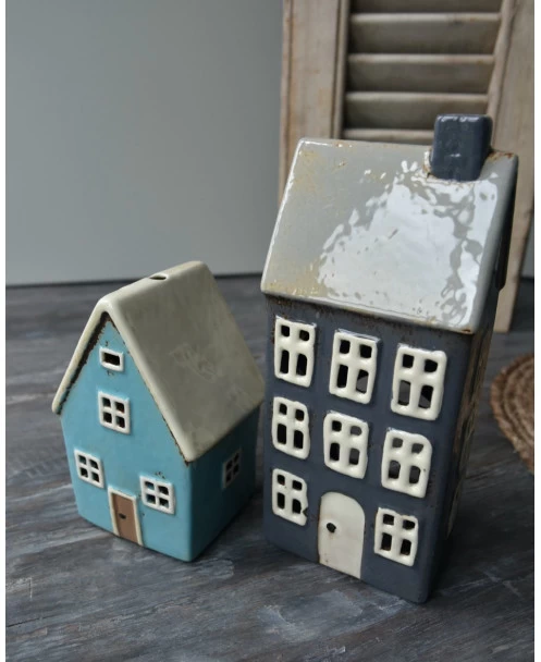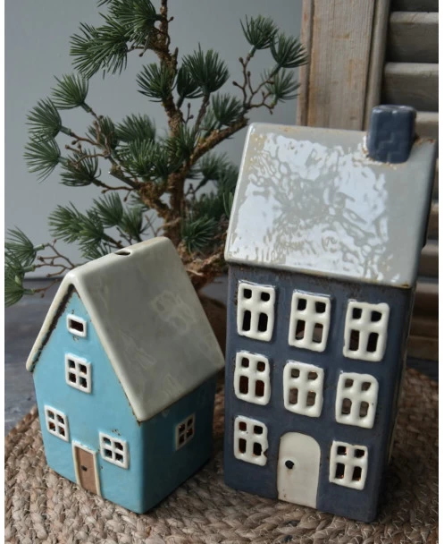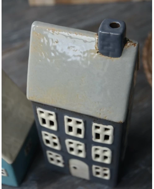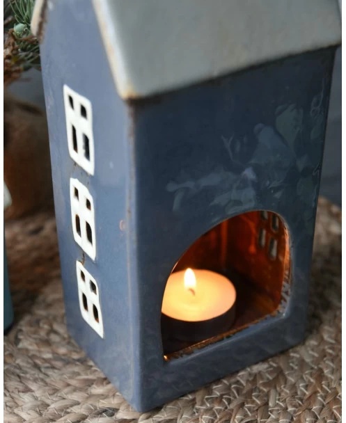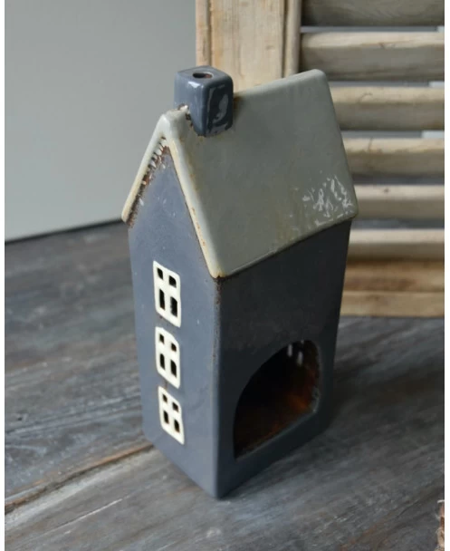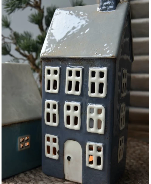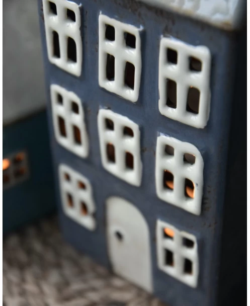 Theelicht huisje met open ramen en schoorsteen Nyhavn, IB Laursen. Dit leuke huis is geïnspireerd uit de haven Nyhavn van Kopenhagen in Denemarken met al zijn mooi gekleurde huizen, gevels en raampjes, kan met een theelicht worden verlicht zodat al de raampjes een warme gloed afgeven. Het huis is grijs met lichte ramen en dak waarop een schoorsteen zit. Aan de achterzijde is een groter gat geplaatst zodat het theelichtje er gemakkelijk kan worden ingezet. Het mooie aardewerk heeft een zijde glans afwerking en de huisjes zien er zoals in de haven gedateerd uit (dus niet te strak, echt gezellig). De huisjes zijn in meerdere kleuren en modellen verkrijgbaar.Â