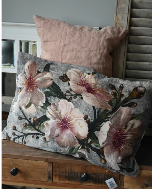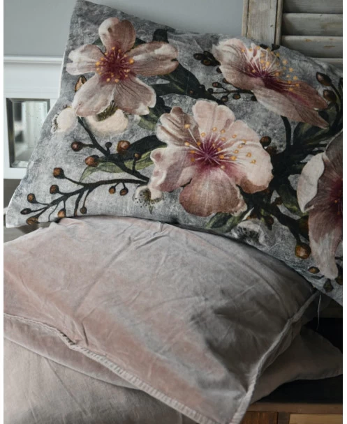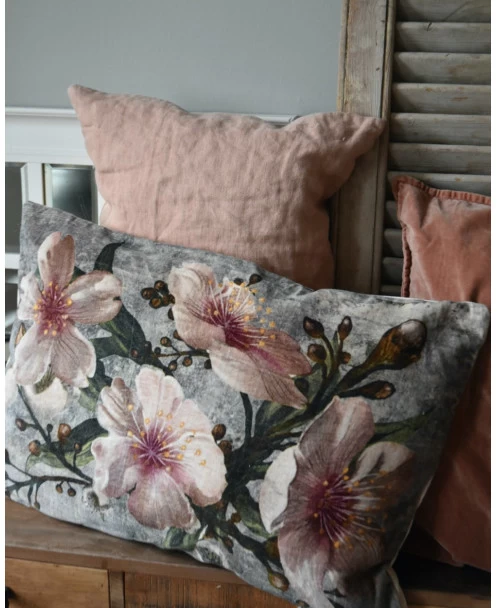 Velours kussen met pastel kleurige bloemen rechthoekig. Dit prachtige kussen in een rijke velours stop heeft een bloemenprint met pastel kleurige bloemen erop. Het model is rechthoekig, de kussenhoes kan met een rits open worden gemaakt, dit kussen is inclusief binnenkussen en de achterzijde van het kussen is effen cream velours. De mooie bloemenprint kan op heel veel manieren worden gecombineerd met bijvoorbeeld de mooie Tuscany kleuren voor een mooie pastel roze of liever nog minder kleur de burned roze kussenhoezen van IB Laursen.Â