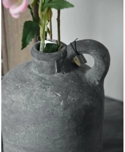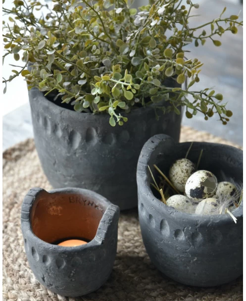 Vintage grijze pot met reliëf en oortjes groot, Brynxz. Deze leuke pot is in een rond model het twee oortjes en een reliëf rand. U kunt de pot als planter gebruiken met een plant of er een kaars in branden. Ook kunt u op creatief gebied alle kanten op. De pot is van aardewerk gemaakt en heeft een grijze vintage afwerking, waardoor hij iets meer geleefd eruit ziet wat karakter geeft. Zo is er ook geen enkele pot precies hetzelfde. De pot is ook in twee kleinere maten verkrijgbaar (zolang de voorraad strekt). De pot is niet 100% waterdicht, wij adviseren om altijd een binnenpot of plastic te gebruiken wanneer u er een echte plant in zet.