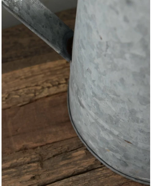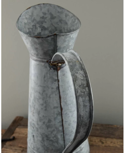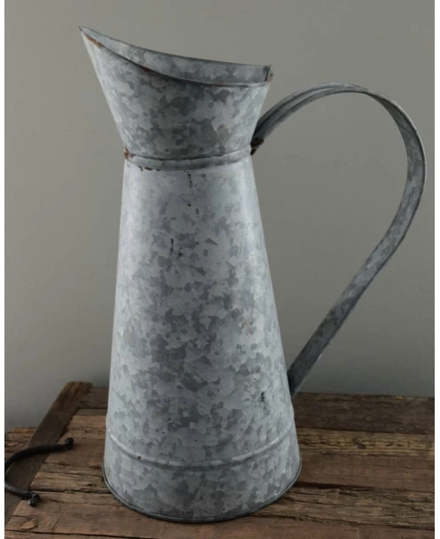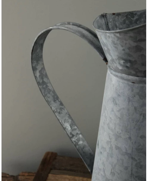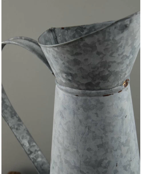 Vintage zinken kan. Deze grote zinken kan heeft een grote schenktuit en een groot oor. Het model is heel eenvoudig en toch heel sierlijk. Op verschillende plaatsen zijn kleine roestplekjes wat een geleefd uiterlijk en sfeer geeft. De kan staat geweldig met droogbloemen.