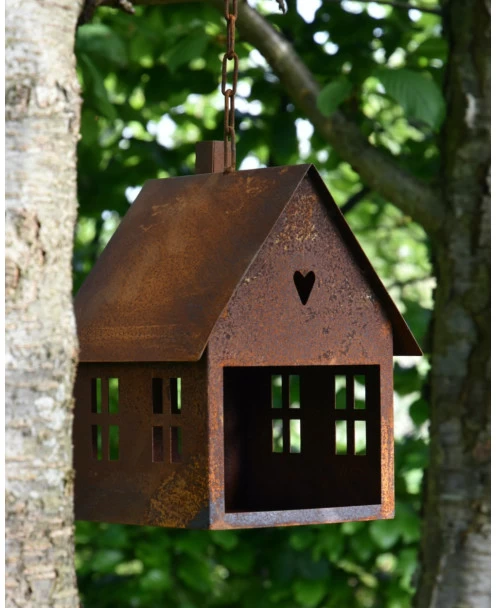 Vogel voeder huisje van roest metaal aan ketting. Dit leuke huis van metaal hangt aan een ketting met haak om op te hangen, het huis heeft ramen een dak, schoorsteen en een hartje in de top. Aan de achterzijde zit een ruim gat waar de vogeltjes gemakkelijk in kunnen om zo het ‘strooivoer’ wat in het huisje ligt gezellig op te eten met voor de vogels uitzicht door de open ramen….