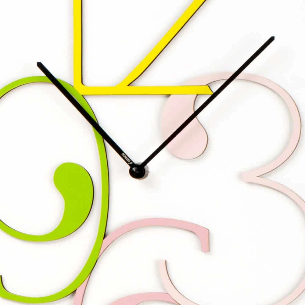 Het is een klok met een leuke en speelse moderne geest , gemaakt van hout met een matwitte basis met gekleurde cijfers gesneden door laser, voor een unieke en designcreatie.