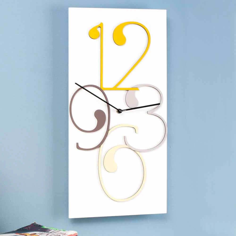 Wandklok van ondoorzichtig wit hout met gekleurde cijfers, twee versies van rechthoekig en modern design gemaakt in Italiƫ.