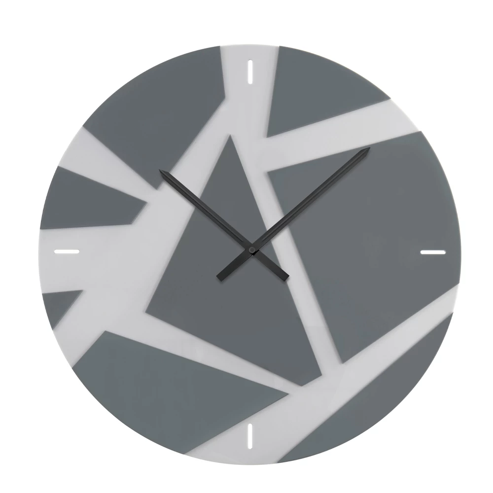 Deze wandklok met een rond ontwerp wordt gekenmerkt door zijn suggestieve spel van geometrieën gecreëerd door de overlapping en combinatie van twee plexiglas elementen van verschillende kleuren.